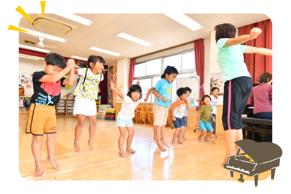 ピアノの音色に合わせて、全身をつかって表現することや大きな声で気持ちを表現することを大切にしている。